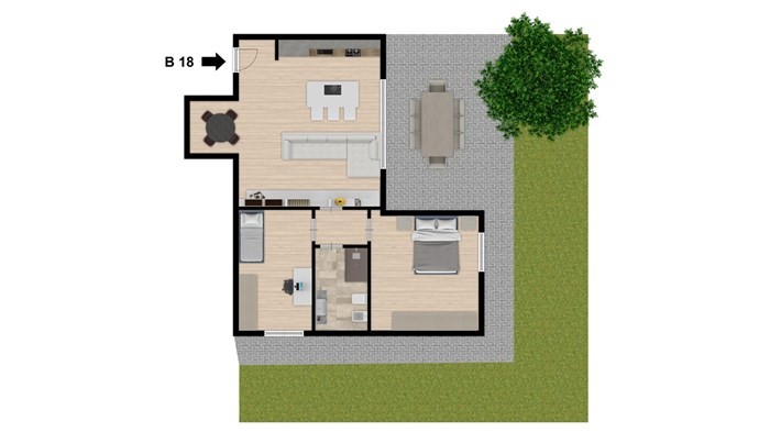Impianto fotovoltaico a servizio delle parti comuni dell'intero complesso. APPARTAMENTO B18 - Tre locali posto al piano terreno con giardino su due lati, composto da: ingresso nella zona living con cucina a vista serviti da porticato affacciato sul giardino esposto ad est, disimpegno che conduce alla zona notte dove troviamo una camera matrimoniale, una cameretta e un ampio bagno con doccia. Gli immobili sono in PRONTA CONSEGNA con la possibilità di personalizzare le finiture secondo il tuo gusto. Inoltre è possibile visionare in loco un appartamento campione completamente arredato, per toccare con mano la qualità e il design che ti aspettano. Chiama i referenti al numero 039-8962312 per fissare la visione.